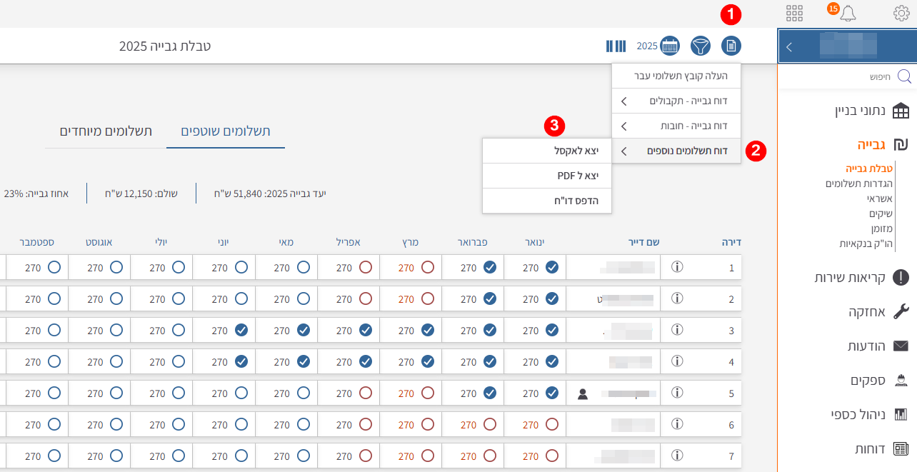 ודא שאתה נמצא במסך "טבלת גבייה 2025". ניתן להגיע אליו דרך התפריט הימני תחת: גבייה > טבלת גבייה