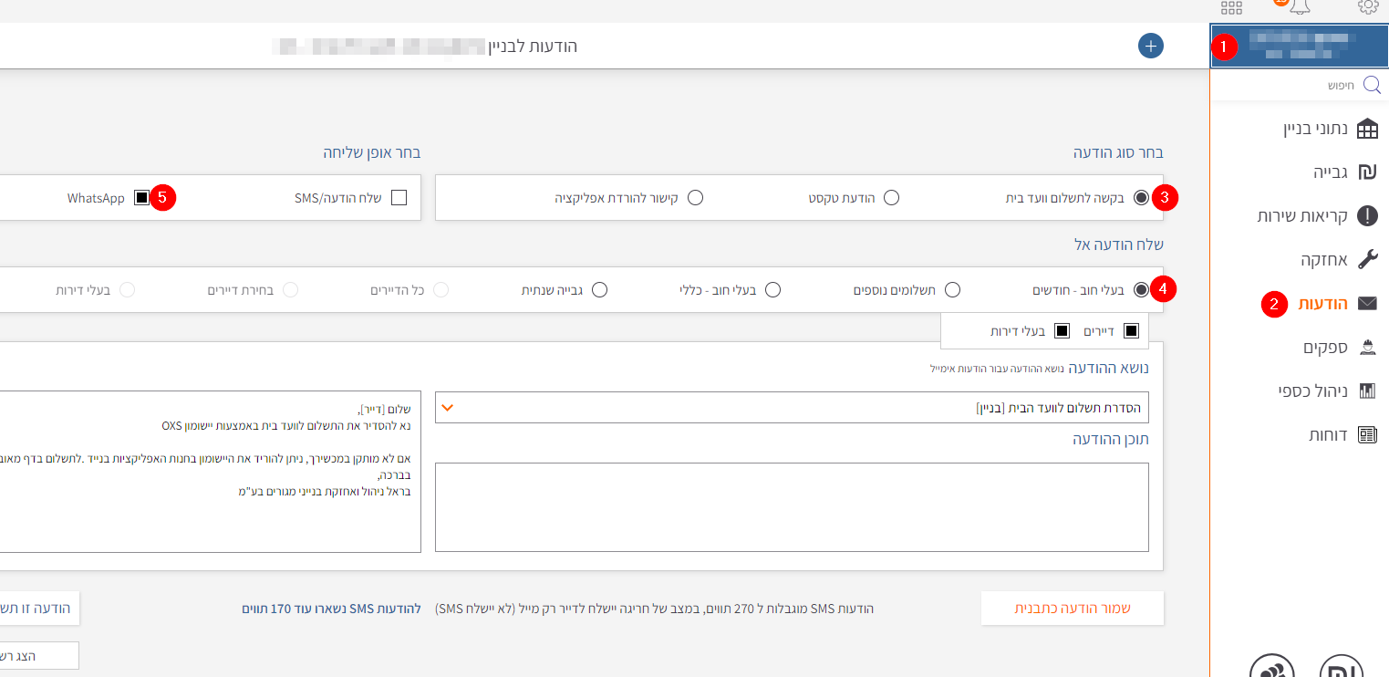 בחירת בניין > הודעות > נבחר בקשה לתשלום ועד בית > נבחר "בעלי חוב חודשיים" ו- דיירים / בעלי דירות > נסמן אפשרות למשלוח בווטסאפ > נלחץ על "שלח הודעה"