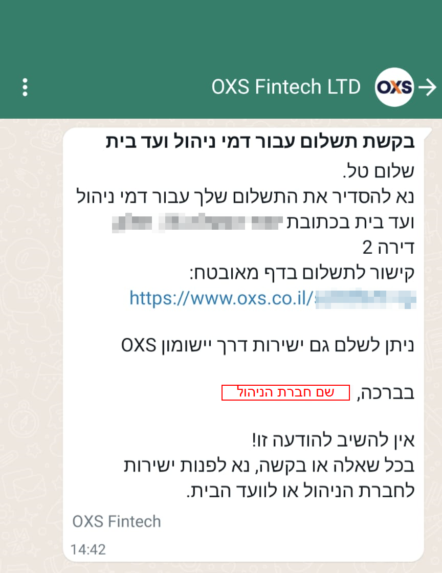 דוגמא להודעת ווטסאפ שנשלחת לדייר: