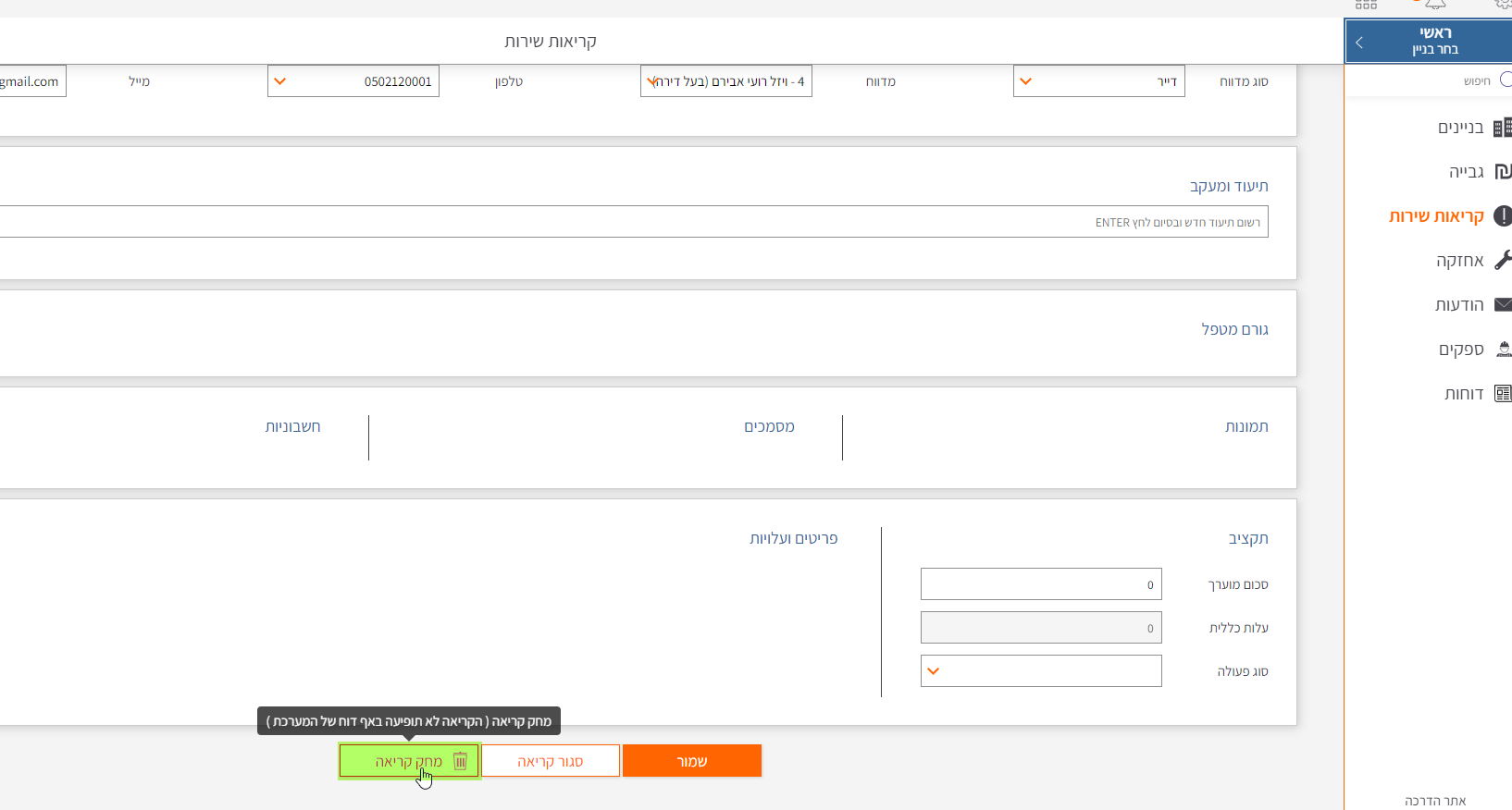 בחירת בניין > קריאות שירות > בחירת קריאה > בתחתית עמוד פרטי הקריאה נלחץ על "מחק קריאה"