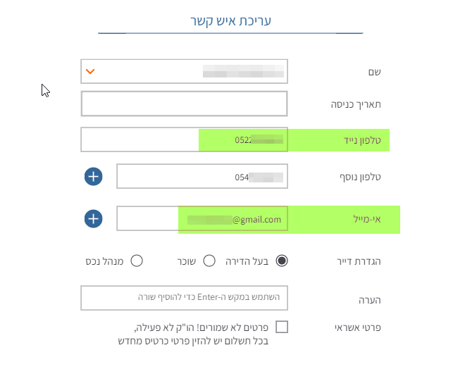 - דייר אחד שהוא "שני דיירים" - במקרים רבים מוגדרים בני זוג בדירה כדייר אחד, למשל "ישראל ונורית כהן". אך רק הדייר שמספר הטלפון שלו הוא הראשי, יכול לצפות בדוחות. במקרה של שני בני זוג, ייתכן שהמייל נשלח לאחד מהם כי כתובת המייל שלו מוזנת כמייל ראשי ("מייל נוסף" לא יקבל דוחות). עליכם לפצל את הדייר הזוגי לשני דיירים נפרדים בדירה.
