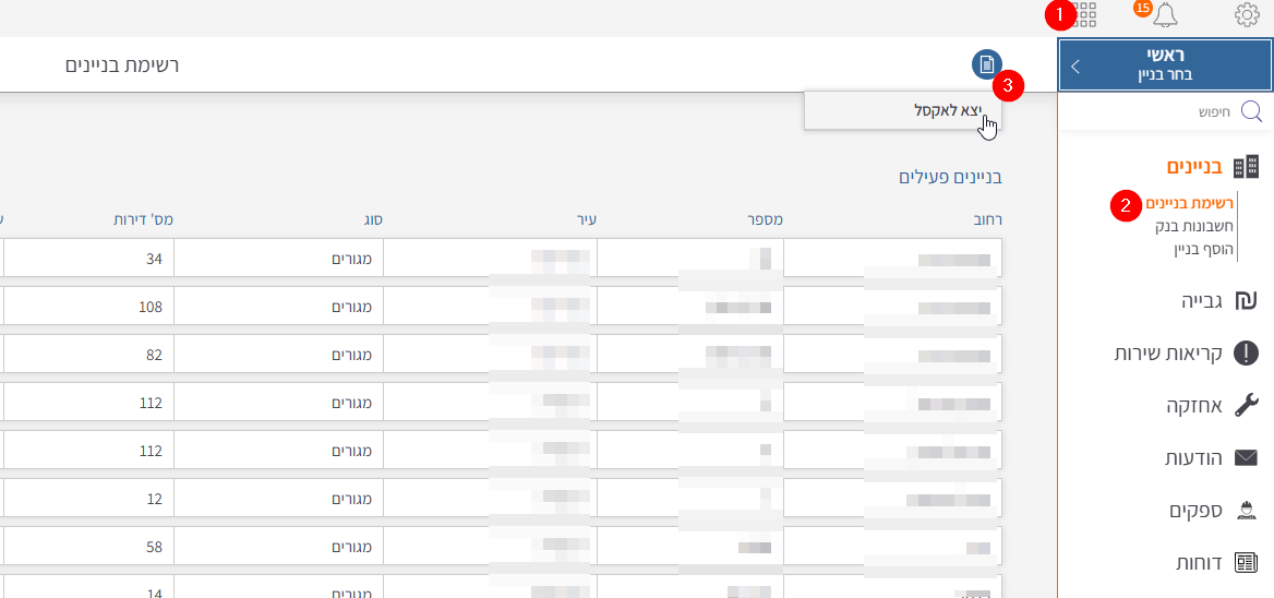 תיוגים: רשימת בניינים, דוח בניינים, יצוא לאקסל בניינים