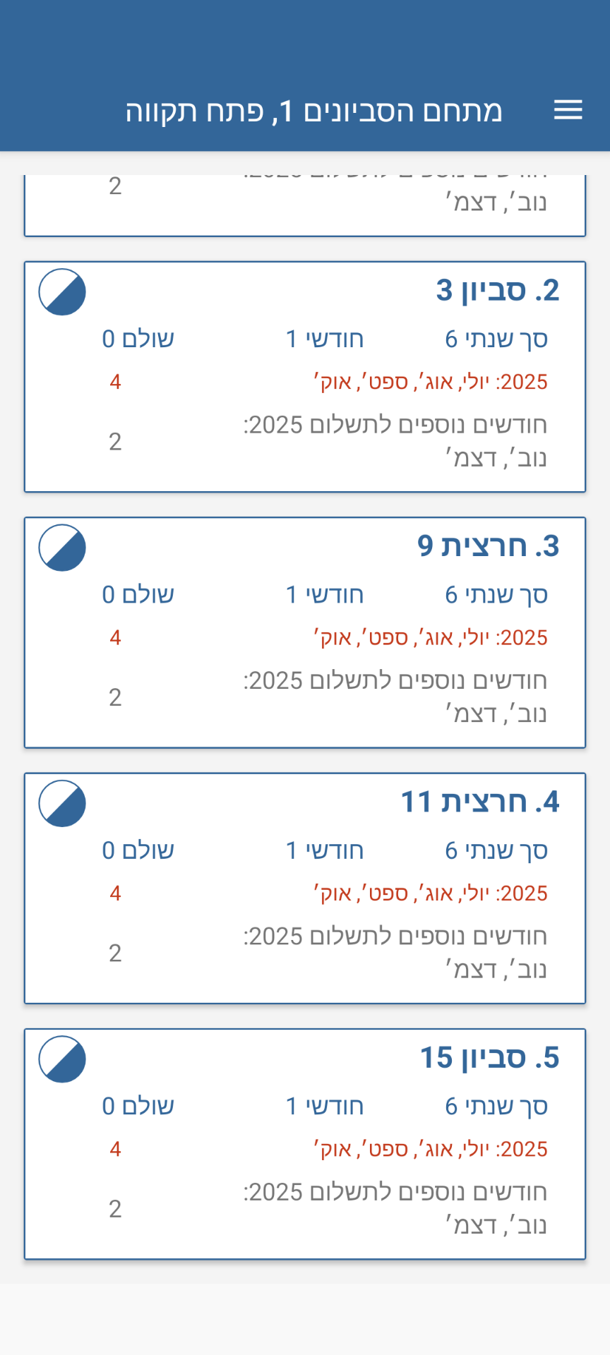 במסך זה ניתן לראות את פירוט התשלומים הפתוחים, מועדי החיוב, וסוגי החיובים (ועד חודשי, תשלום נוסף, גבייה מיוחדת ועוד).