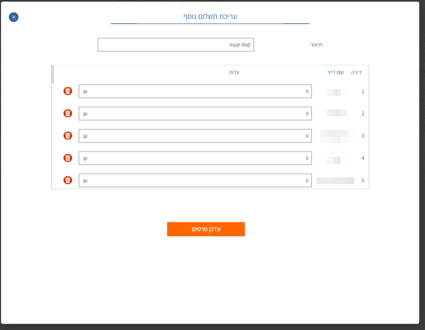 - אם אף דייר עוד לא שילם, ניתן למחוק את התשלום וליצור תשלום חדש עם הכינוי הנכון.