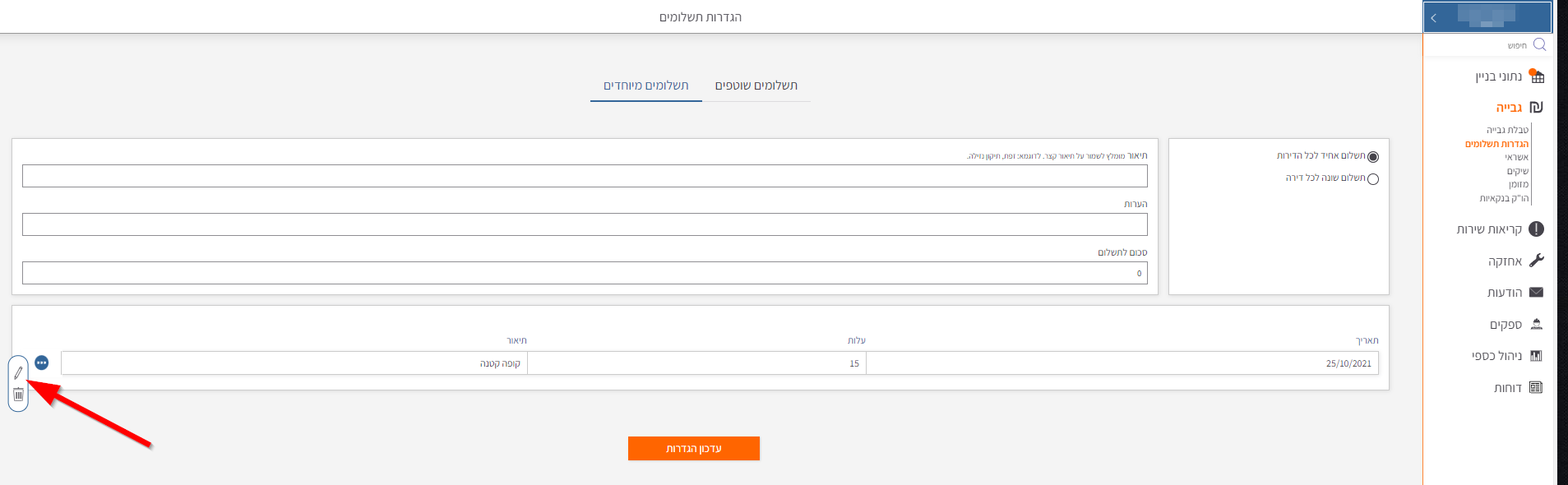 בחירת בניין > תפריט גבייה > הגדרות תשלומים > תשלומים מיוחדים >