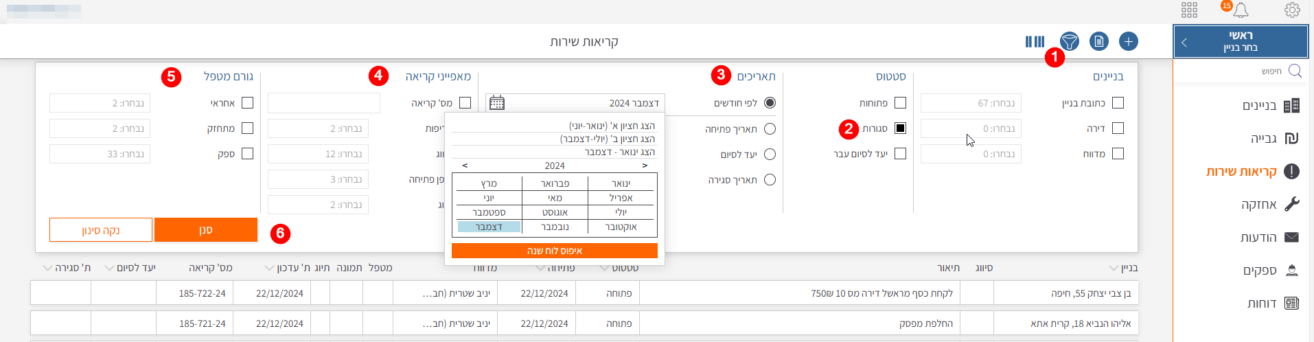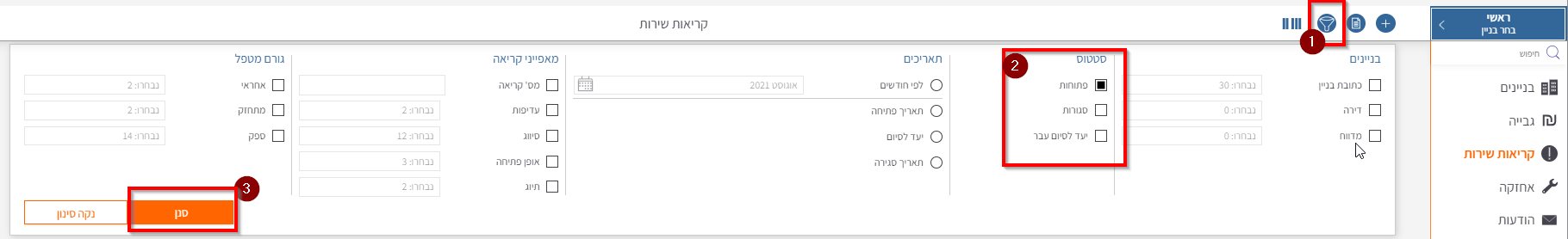 בחירת בניין > קריאות שירות > כלי סינון > בחירת אפשרויות סינון שונות > סנן