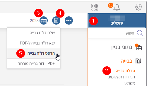 1. בחירת בניין > 2. טבלת גבייה > בחירת דירה > 3. בחירת שנה > 4. לחיצה על כפתור "דוחות" (צד ימין למעלה) > 5. הפקת דוח