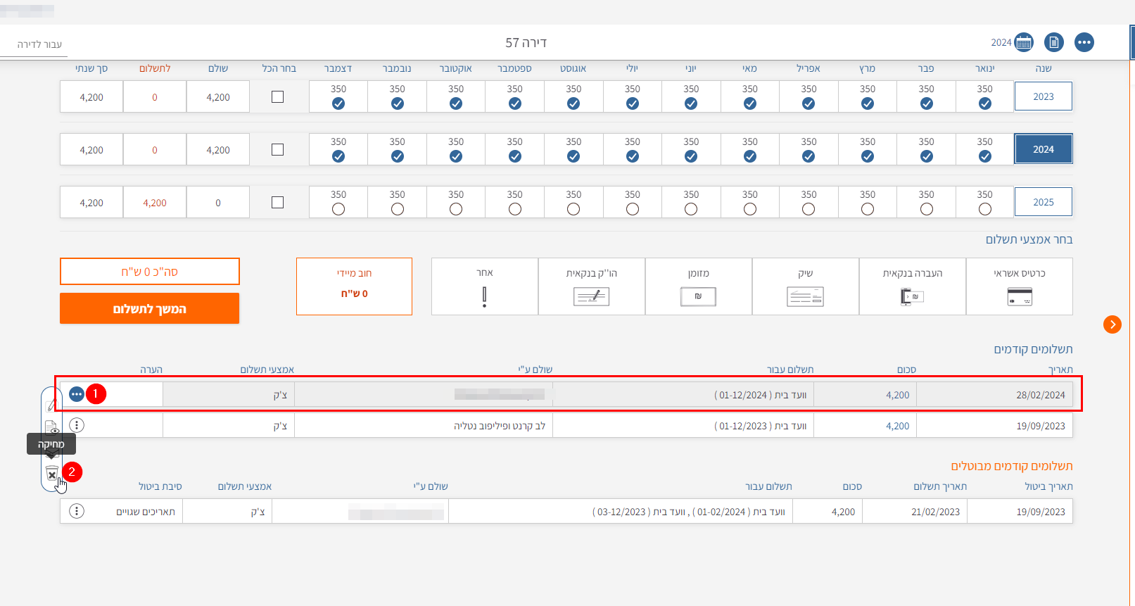 2. בחירת אישור התשלום ולחיצה על אפשרות מחיקה (תפריט אפשרויות בקצה השורה)