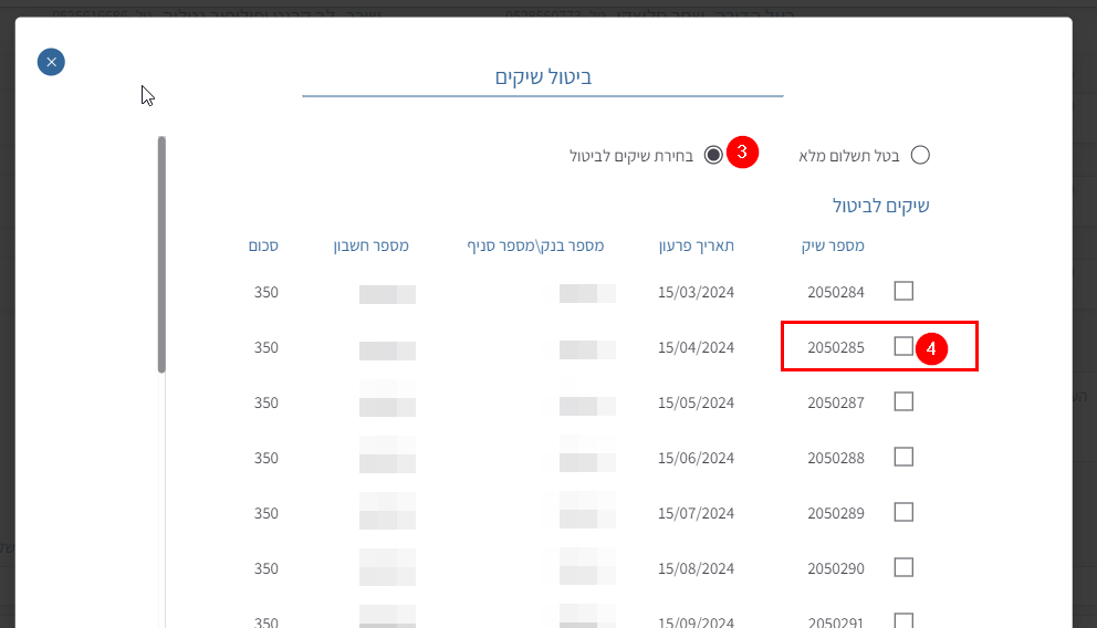 3. בחירת הצ'קים שצריך לבטל (כולם או חלקם)