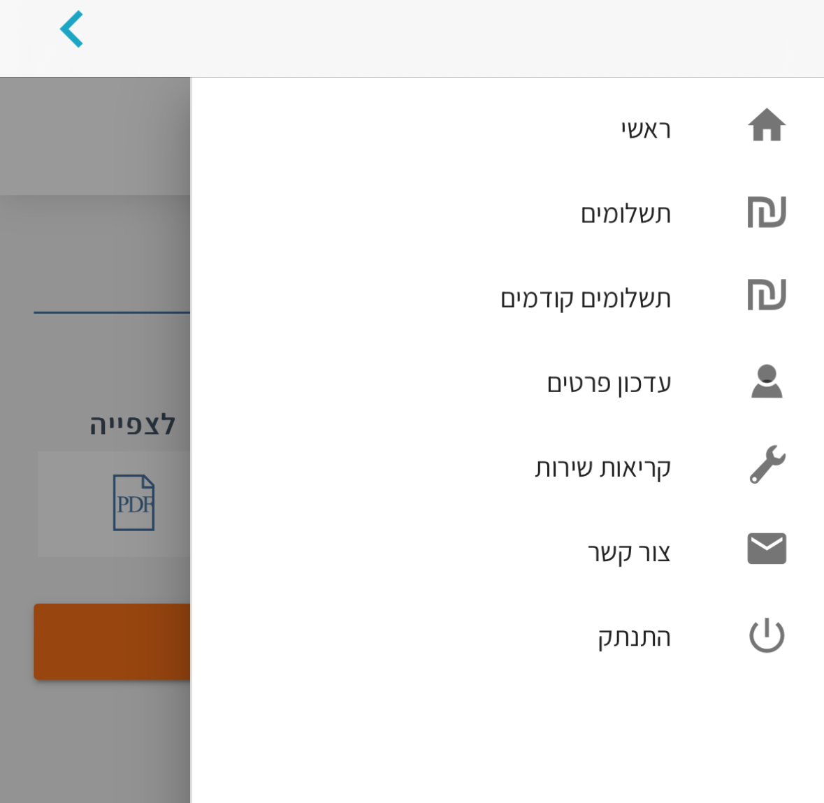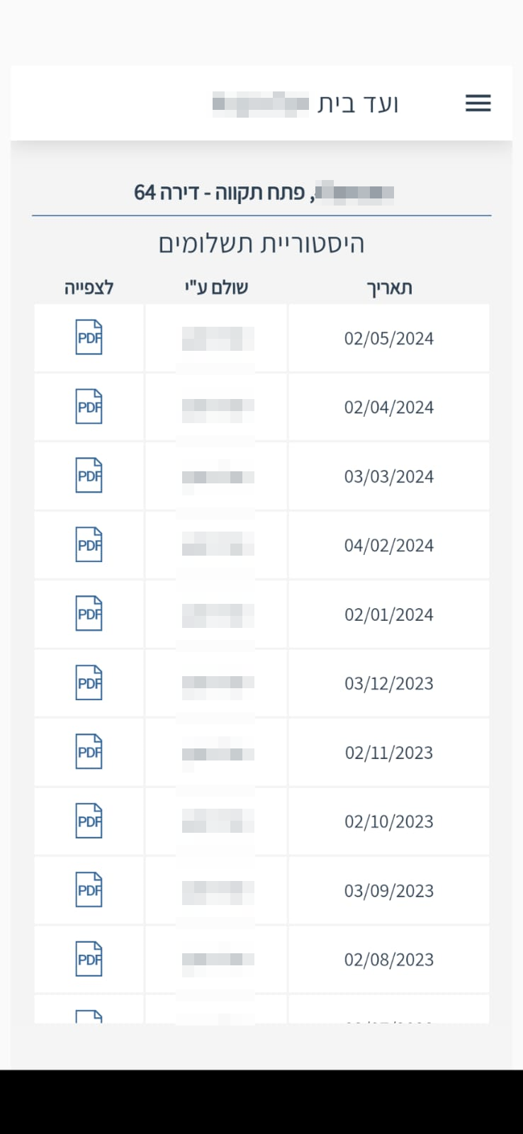 - הדייר צריך להיכנס לאפליקציה בנייד שלו > תפריט > היסטוריית תשלומים. כאן יופיעו כל מסמכי ה-PDF של התשלומים שביצע. הדייר יכול להוריד את הקבצים, לשלוח, להדפיס, לשתף ובעצם לעשות כל מה שהטלפון הנייד שלו יודע לעשות עם קבצי PDF.
