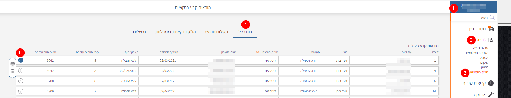 בחירת בניין > תפריט גבייה > הו"ק בנקאיות > דוח כללי > בשורת הדירה בחירת תפריט (בצד שמאל) > לחצן מחיקה