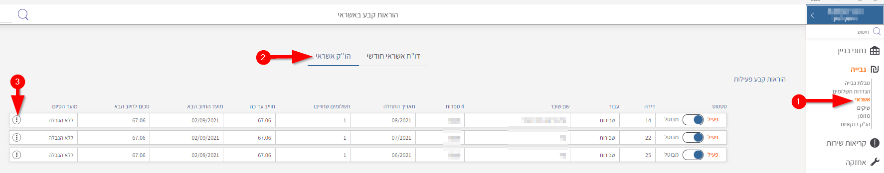 בחירת בניין > תפריט גבייה > אשראי > הו"ק אשראי > בשורת הדירה לחיצה על תפריט אפשרויות (בצד שמאל) > עריכה (עפרון) > עדכון פרטים בחלון ושמירה