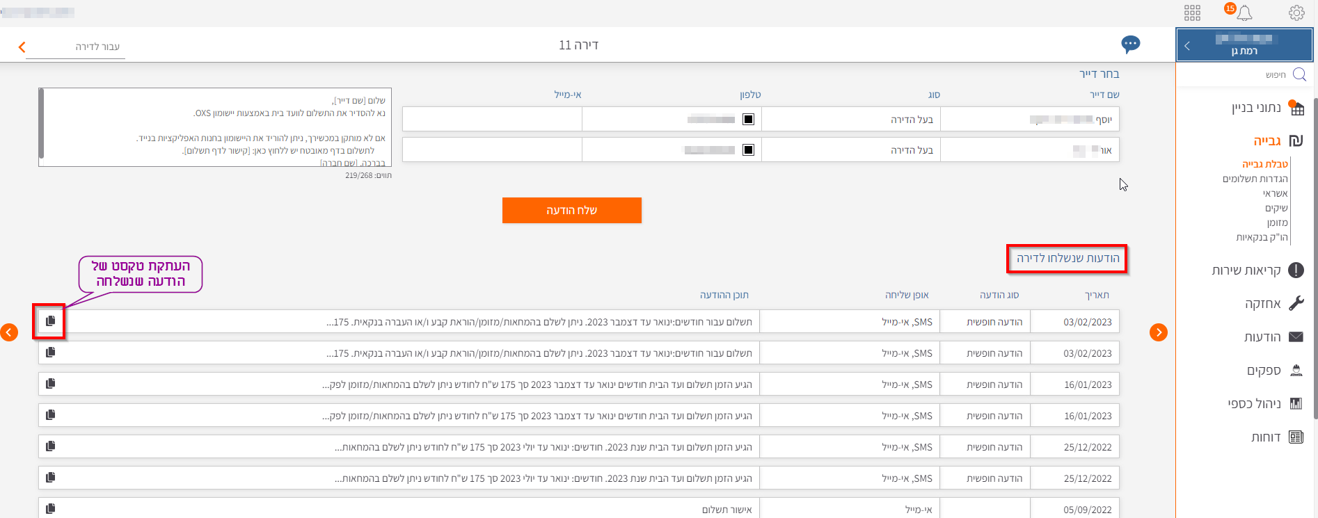 הודעות שנשלחו, נרשמות בכל דירה> בתפריט הודעות> הודעות שנשלחו לדירה