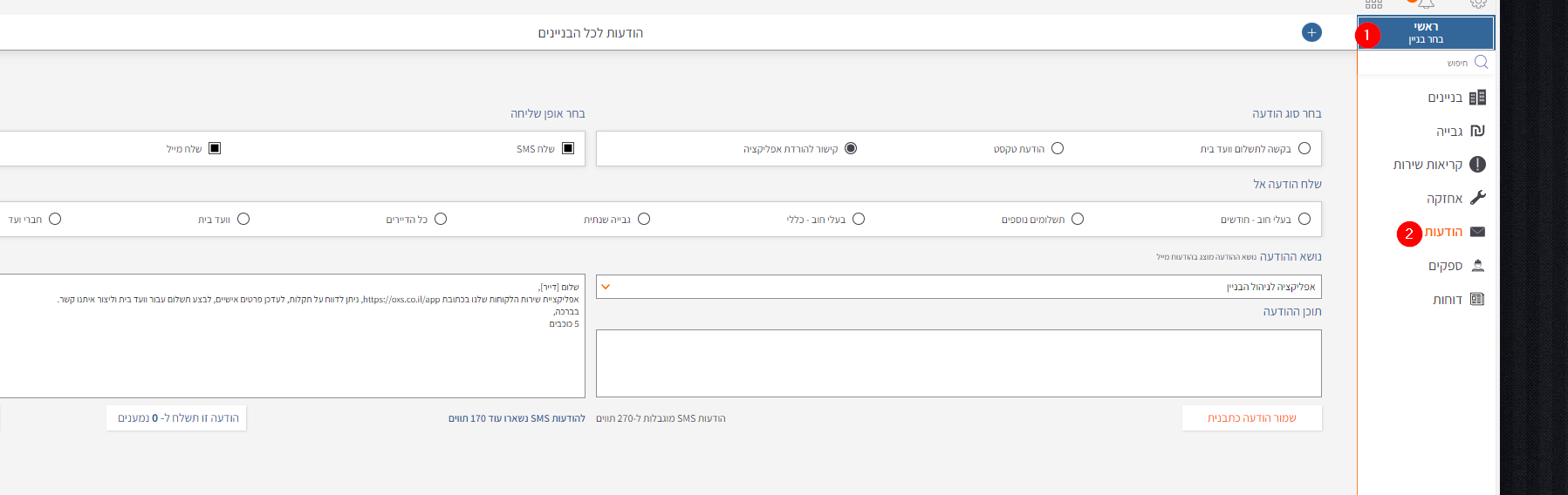 או לבחור בניין ולשלוח הודעות לדייריו