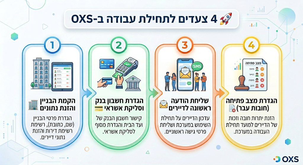 ברוכים הבאים למערכת OXS! כדי שתוכלו להתחיל לנהל את הבניינים שלכם ביעילות ובקלות, ריכזנו עבורכם את ארבעת הצעדים הראשונים להקמה מוצלחת של המערכת.